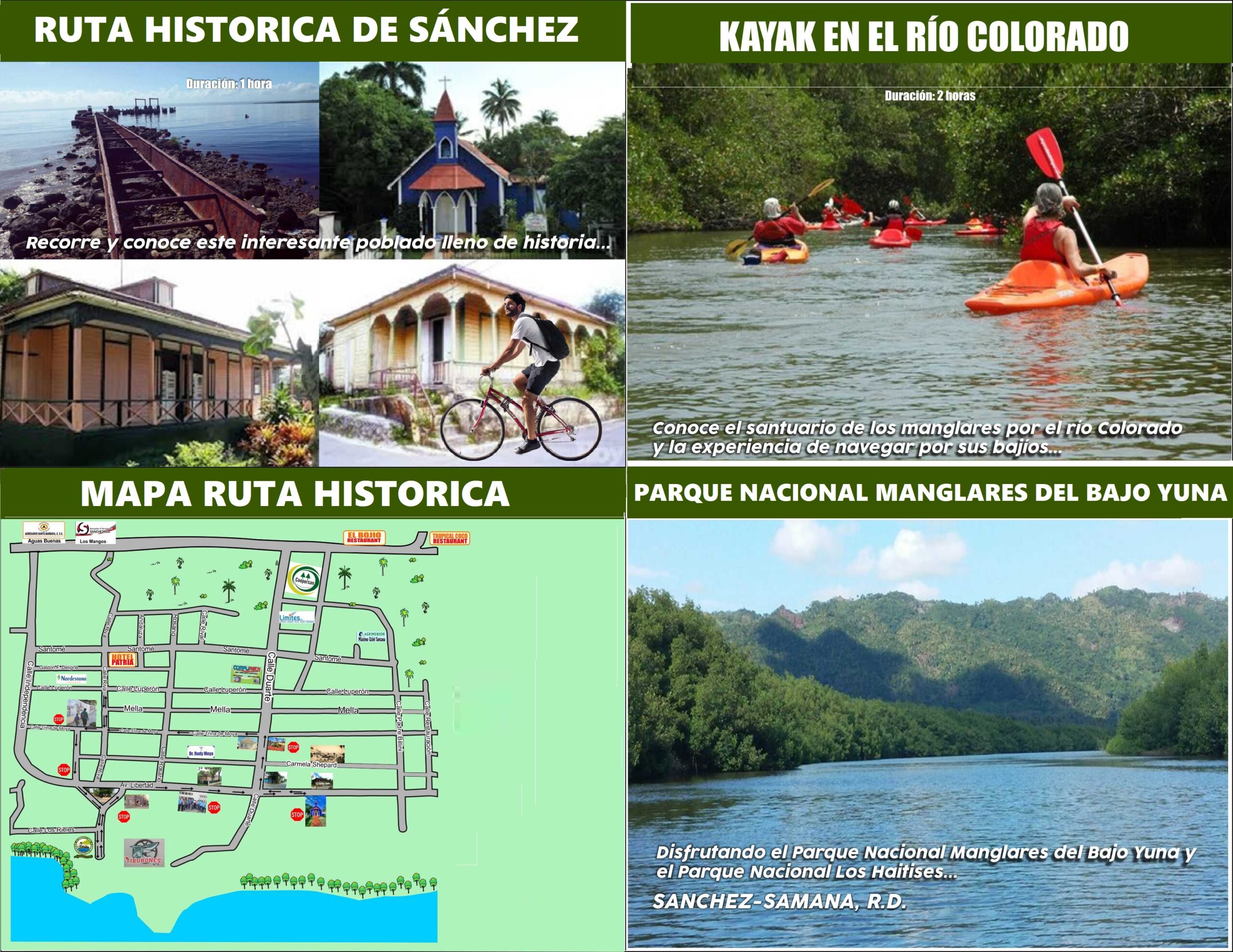 Esta ruta consiste, en un paseo en City Tren al Parque Nacional Manglares del Bajo Yuna, durante este recorrido podrás conocer parte de la historia del Municipio Histórico de Sánchez y su entorno. De igual manera incluye un recorrido por el entablado construido en las orillas del Río Colarao, llamado así por el color rojo de sus aguas, de modo que el visitante tiene un contacto directo con toda la fauna y flora que compone el Parque Nacional y una mirada práctica de la forma de vida de los habitantes de esta zona, cómo viven, de qué viven y su cultura.